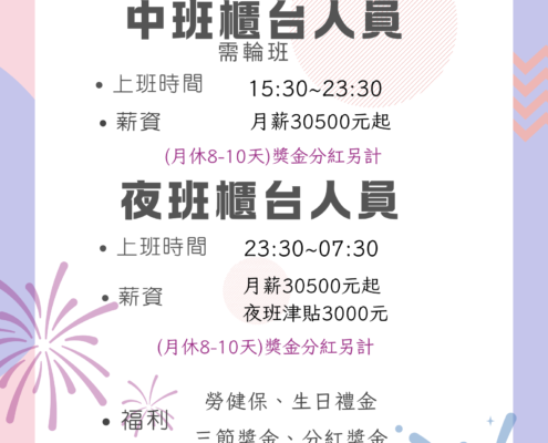 招募人才2026-03-02嘿喲!飯店宛如一艘夢幻巨輪,在商業海洋中乘風破浪。此刻,我們急需一群身懷絕技的「船員」。不管你是能操持全局的“船長” ,還是擅長後勤保障 https://dubaimotel.com.tw/wp-content/uploads/2026/03/中夜櫃台.png 2245 1587 q9120499999 /wp-content/uploads/2025/05/logo-1.png q91204999992026-03-02 13:50:222026-03-03 14:00:52招募人才